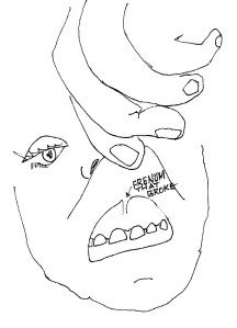 There is a thin triangular piece of flesh that joins the area above the front teeth to the inside of the upper lip – you can touch it with your tongue. The superior maxillary frenum. Rick D’s contact with my face had enough force to tear that triangle of flesh out, breaching a dam that had kept my blood circulating in my body. In my memory, blood sprayed everywhere. At least I didn’t stain the rug.