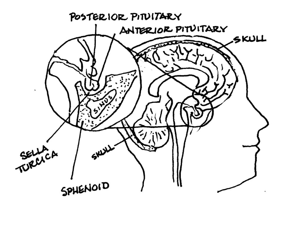 When all parts of the brain are where they belong, the pituitary sits in a crater in the sphenoid called the Sella turcica or Turkish saddle. Should the bones of the skull shift, the pituitary can be pinched. Why would that matter? Although just a tiny, pendulous bleb of tissue, the pituitary is referred to as the “master gland”. If you think about the vast influence of the thyroid and factor in the pituitary’s control over the thyroid, you get an idea of just how bad things can go for someone when these glands don’t function properly.